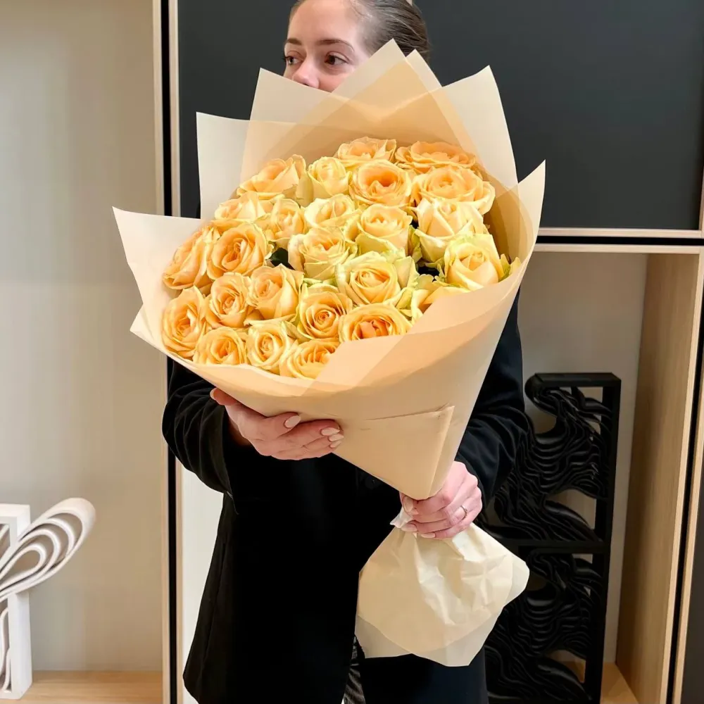 Роскошный букет из 25 кремовых роз высотой 70 см — идеальный выбор для выражения самых нежных чувств. Эти изысканные цветы станут прекрасным подарком на любой праздник и добавят изысканности в интерьер. Кремовые розы известны своей элегантностью и универсальностью, они подойдут как для романтического свидания, так и для поздравления с днём рождения или юбилеем. Подарите радость и красоту с нашим букетом!